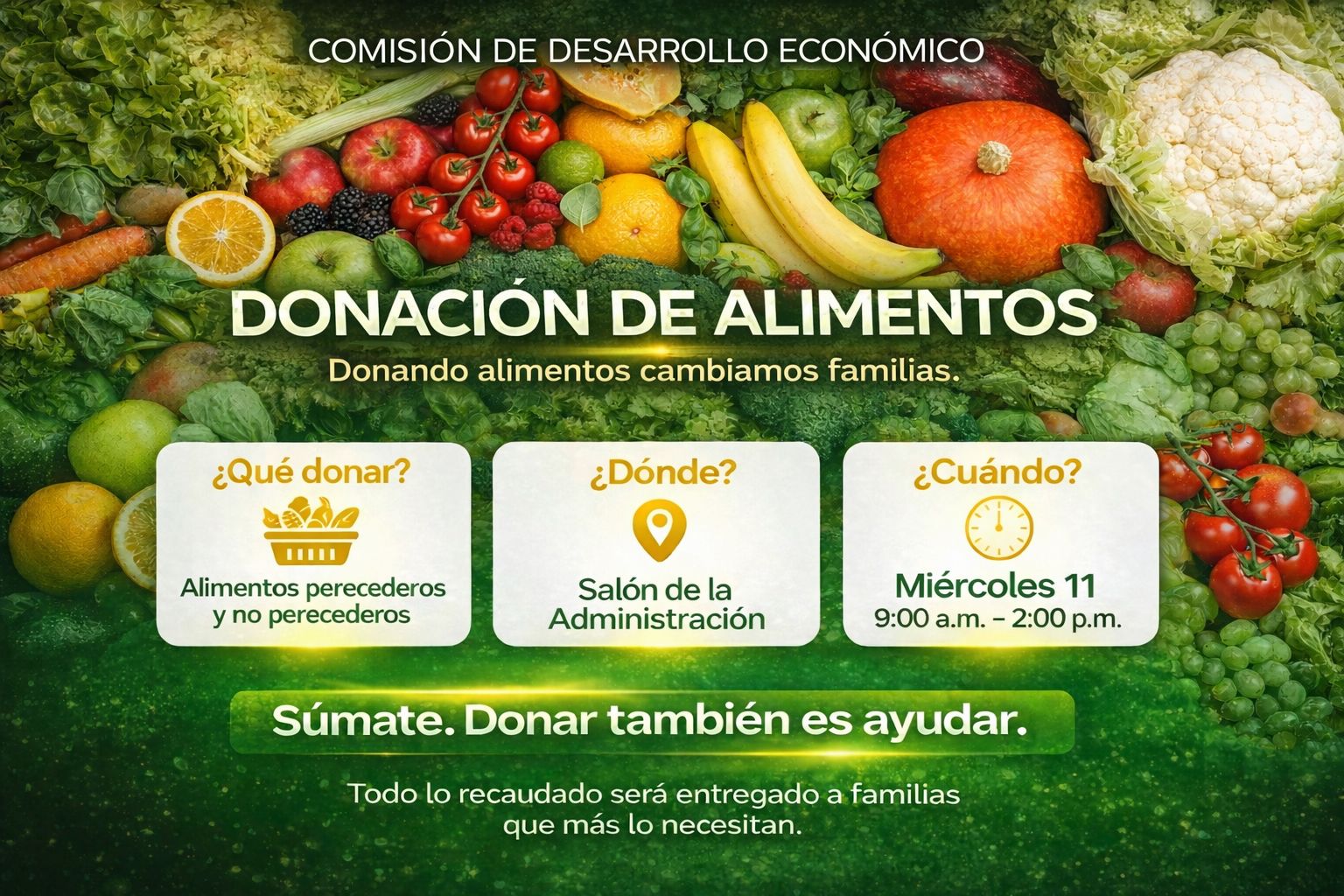 Súmate a la donación de alimentos y ayuda a familias que más lo necesitan. 📍 Salón de la Administración 🗓 Miércoles 11 | ⏰ 9:00 a.m. – 2:00 p.m.